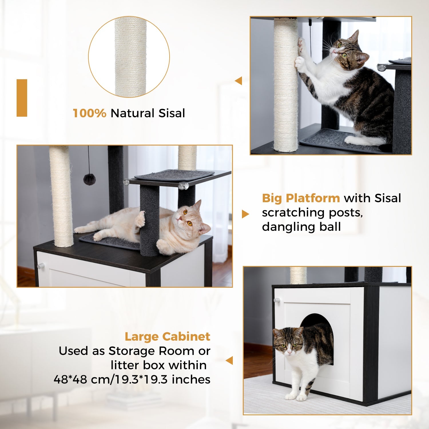- Litter Box Enclosed Cabinet: Space-saving design combines a litter box enclosure and a cat tree.