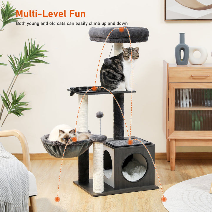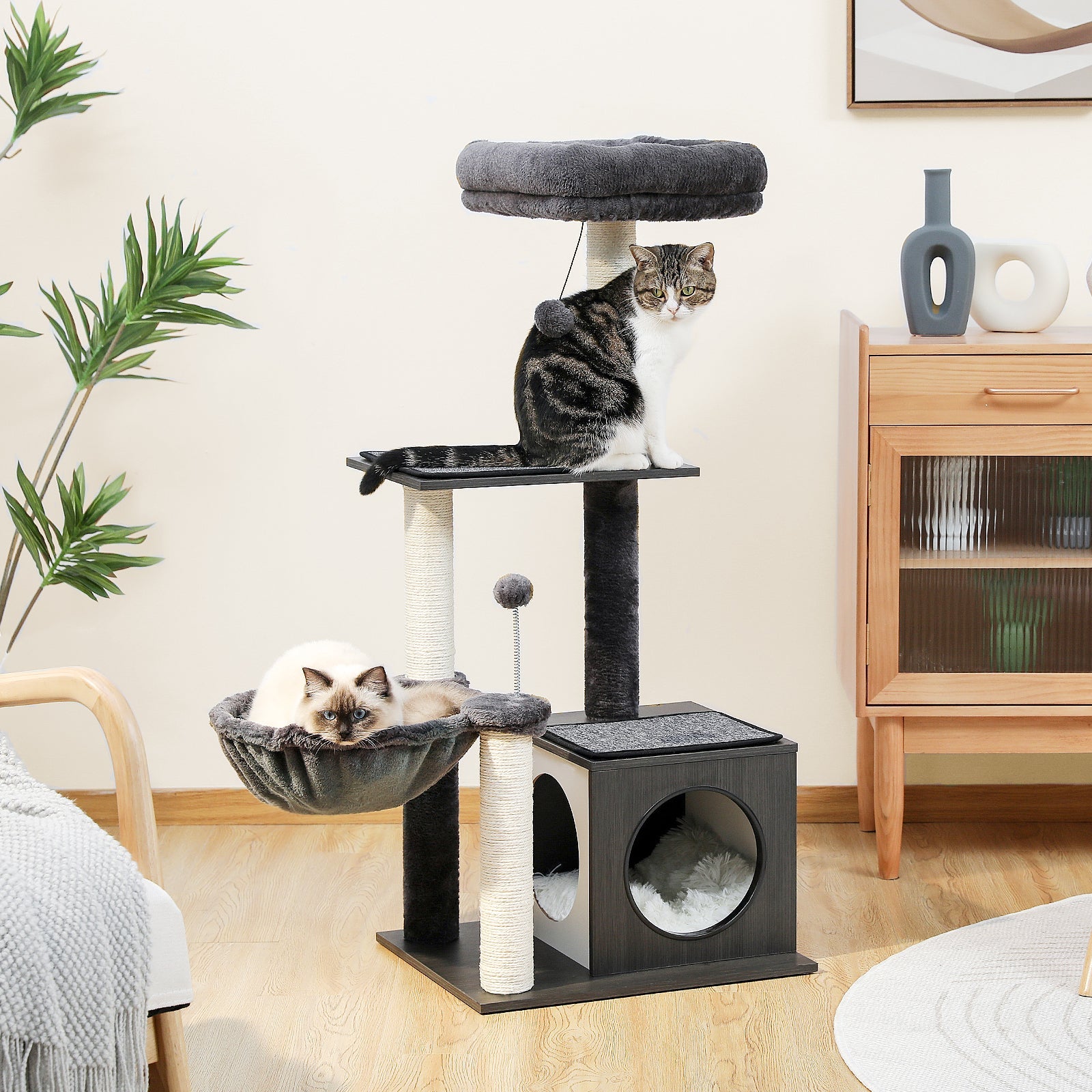 Pawzzoo Hammock Condo Cat Tree Spring Ball is the ultimate all-in-one place for your kitty to do all the things she loves, from hanging out to jumping to honing her professional hunting skills. Lively cats can jump from habitat to habitat and climb to the top of watchtowers. Carefully placed dangling toys give the kitty a thrill in the hunt as she slaps them around until she's satisfied.