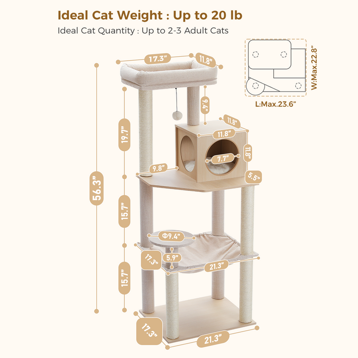 - Spacious Hammock: Enjoy a roomy hammock (21.3"x17.3") accommodating over 20 lbs, providing a cozy lounge for 2-3 cats.