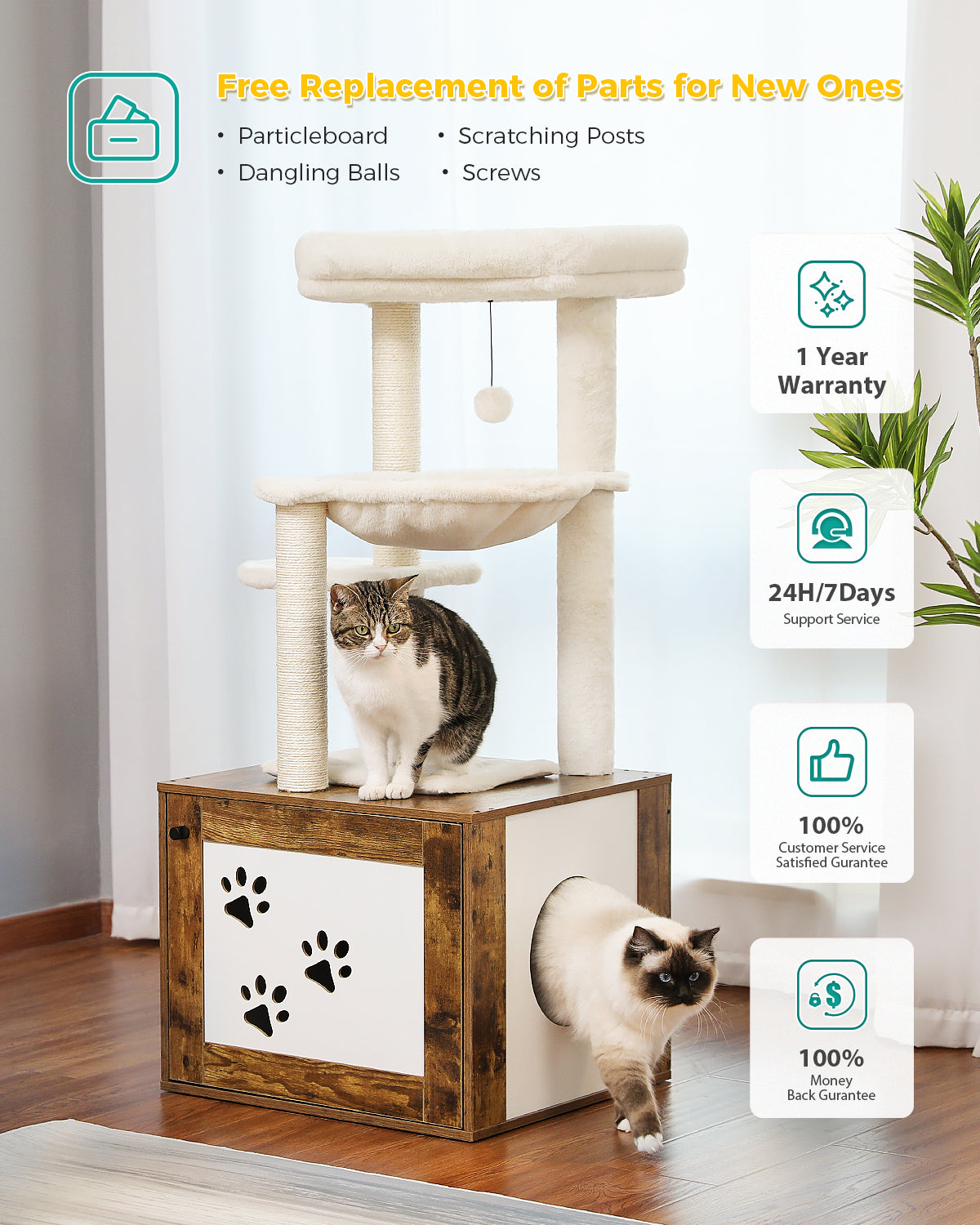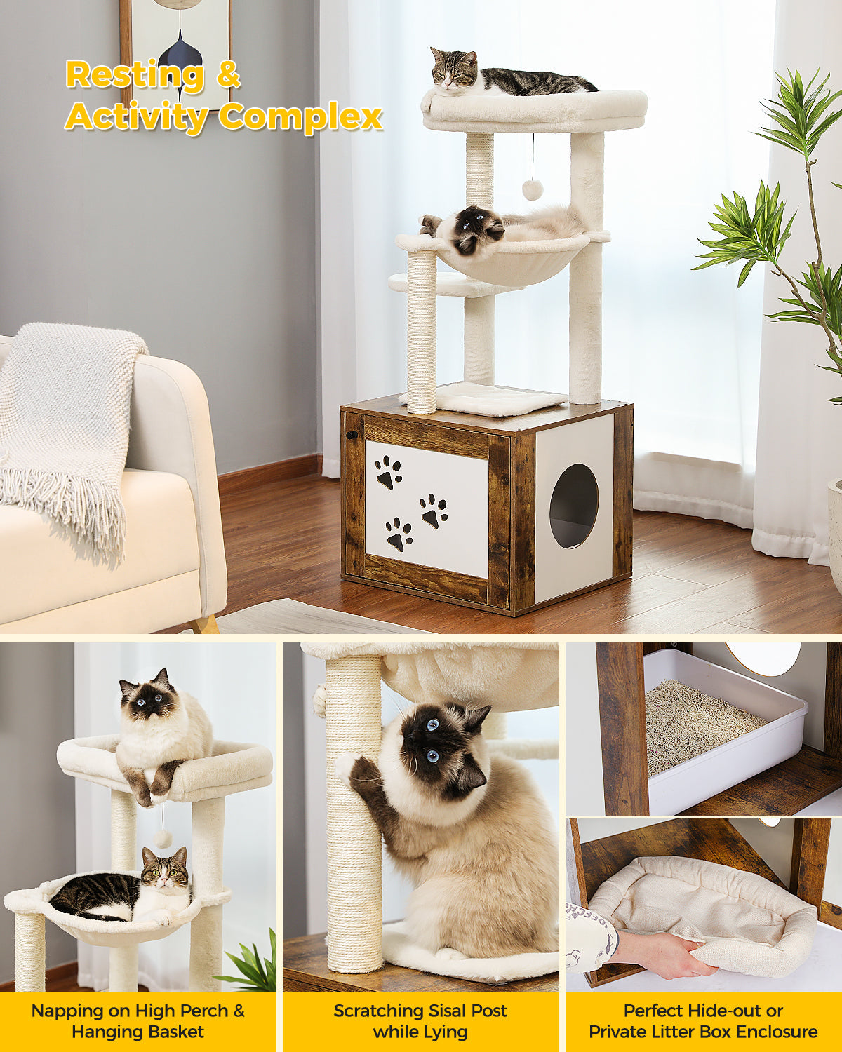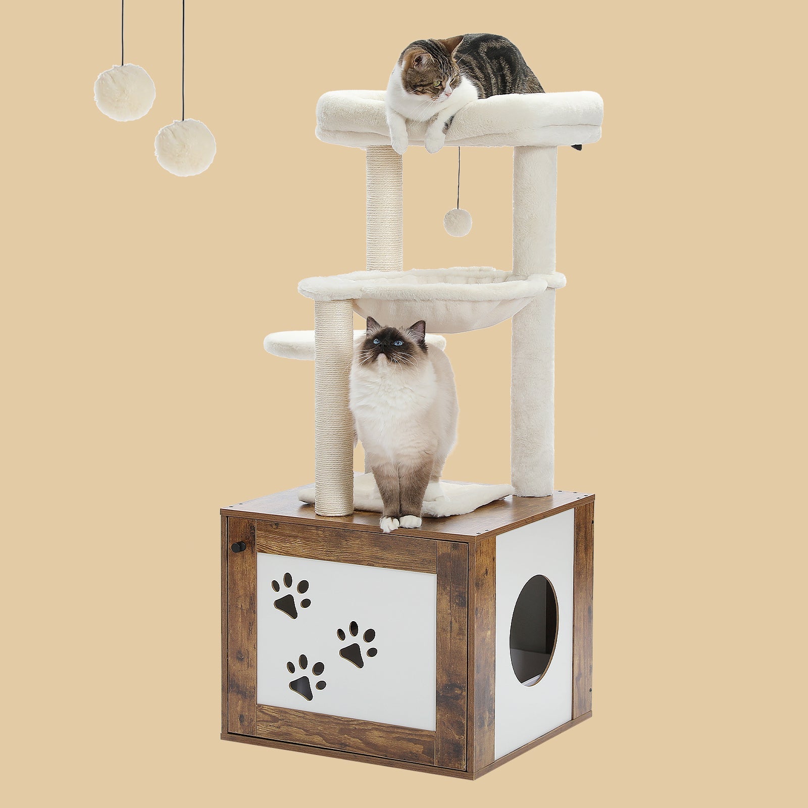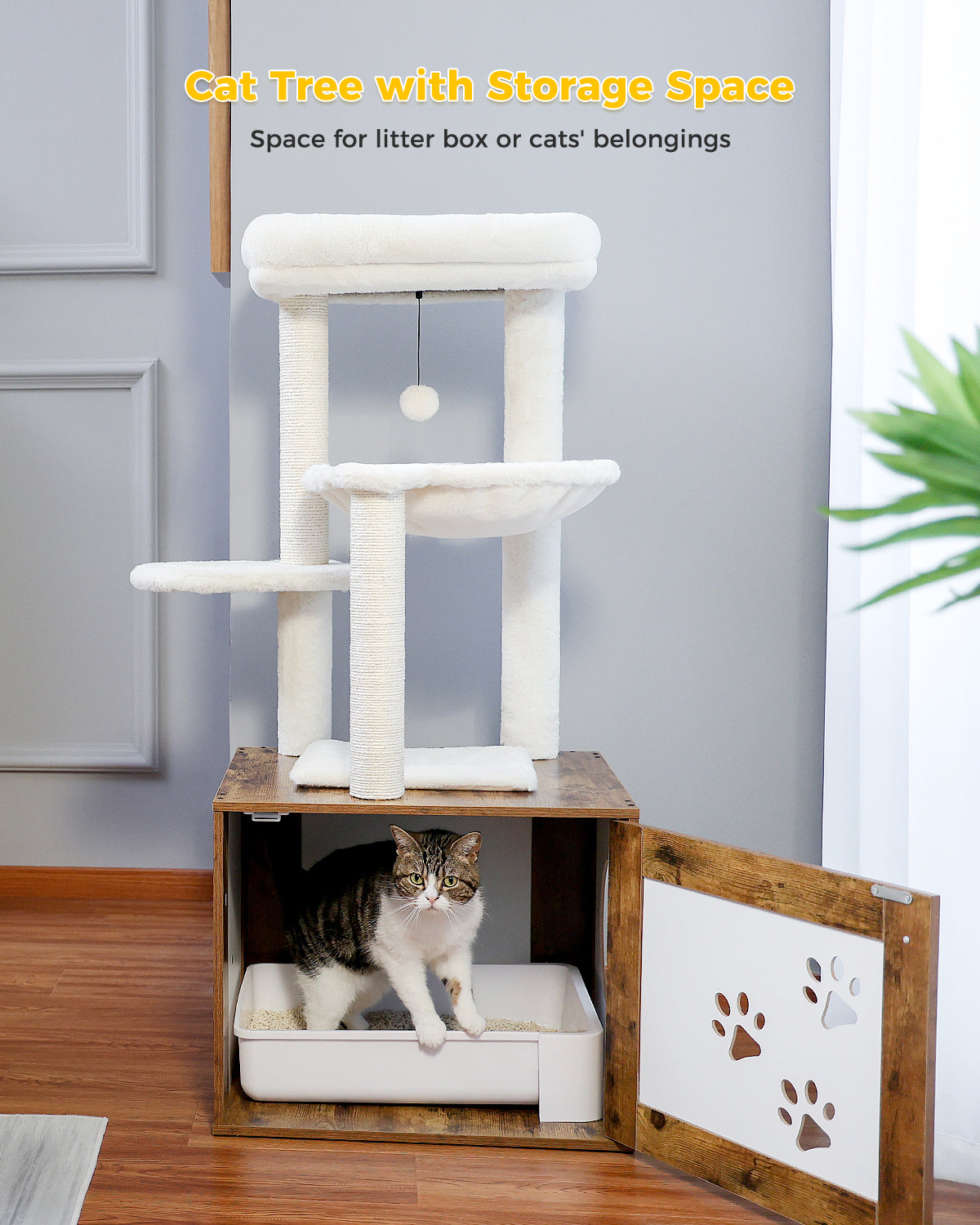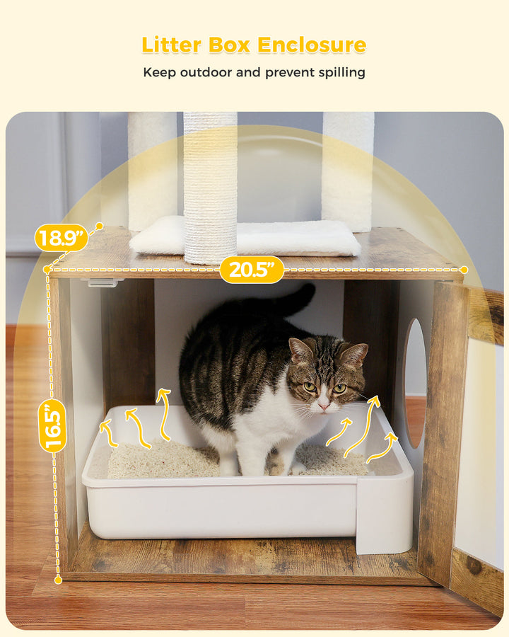 •Sturdy Structure & Multifunction: The litter box enclosure acts as the base of the cat tree, providing a sturdy and solid structure.